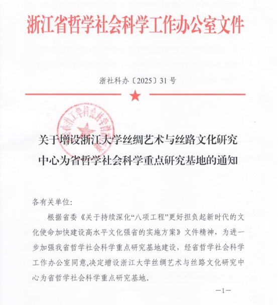 關(guān)于增設(shè)浙江大學(xué)絲綢藝術(shù)與絲路文化研究中心為省哲學(xué)社會科學(xué)重點(diǎn)研究基地的通知