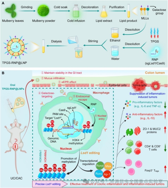 鑒于此,肖波教授團(tuán)隊(duì)開發(fā)了一種經(jīng)實(shí)驗(yàn)室優(yōu)化的口服遞送平臺(tái):將靶向 Lsd1的RNP封裝進(jìn)桑葉來源的脂質(zhì)納米顆粒(MLLs),并加入FDA批準(zhǔn)的穩(wěn)定劑d-α-生育酚聚乙二醇琥珀酸酯(TPGS)(圖1A)。TPGS的引入顯著增強(qiáng)了LNP的脂質(zhì)雙分子層穩(wěn)定性,使其能夠在胃腸環(huán)境中高效遞送RNP,并提高了其穿透結(jié)腸黏液屏障的能力。進(jìn)一步地,TPGS-RNP@LNPs通過上皮細(xì)胞增強(qiáng)通透與滯留效應(yīng)(EPR效應(yīng))在炎癥結(jié)腸組織中富集,并通過半乳糖受體實(shí)現(xiàn)對(duì)巨噬細(xì)胞的特異性靶向。同時(shí),納米顆粒與內(nèi)體膜的膜融合機(jī)制結(jié)合Cas9的核定位信號(hào),確保了RNP的高效核遞送。最終,該系統(tǒng)在小鼠中實(shí)現(xiàn)了顯著的基因編輯效果,并有效緩解了UC和CAC(圖1B)。