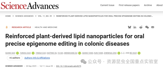 近日,肖波教授、石瀟瀟副教授團(tuán)隊(duì)在國際著名期刊Science Advances(Science子刊)上發(fā)表了題為“Reinforced plant- derived lipid nanoparticles for oral precise epigenome editing in colonic diseases”的研究論文。
