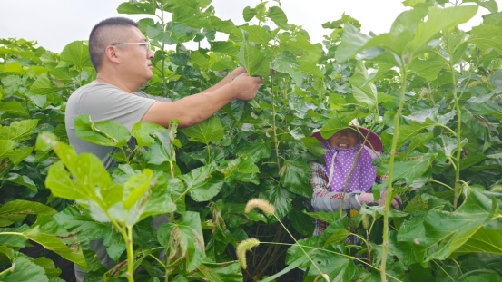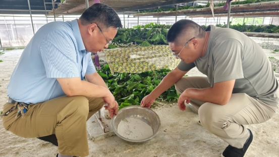 李中華和海安市蠶桑技術(shù)推廣站站長(zhǎng)王軍查看秋蠶長(zhǎng)勢(shì)