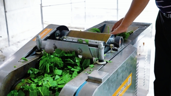 李中華走到切桑機(jī)旁,按下啟動(dòng)鍵,他和工人一起把桑葉倒入進(jìn)料口,隨著刀片上下擺動(dòng),傳送帶上的桑葉細(xì)細(xì)碎碎落進(jìn)下方的籃筐。李中華說(shuō),如果沒有切桑機(jī),用菜刀切桑葉的話,速度很慢。一臺(tái)切桑機(jī)切八九百斤桑葉,只需要半小時(shí)。