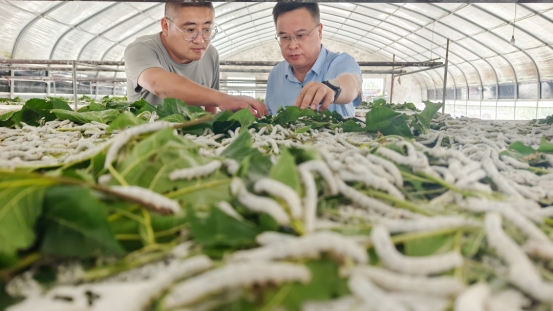 王軍和李中華一起俯下身,順著一排排蠶架細(xì)細(xì)查看秋蠶的大小、顏色和活性。在王軍看來(lái),李中華家的中秋蠶整體情況不錯(cuò)。隨后,經(jīng)驗(yàn)老到的他撥動(dòng)蠶臺(tái)上的桑葉,捻起幾條藏在其中發(fā)黃萎縮的蠶,攤在掌心仔細(xì)辨別,發(fā)現(xiàn)了問題。王軍叮囑李中華,這幾條蠶可能患上了血液型膿病,很容易傳染給健康的蠶。要立即把病蠶撿起來(lái),扔在一個(gè)盆里,用石灰粉掩埋。