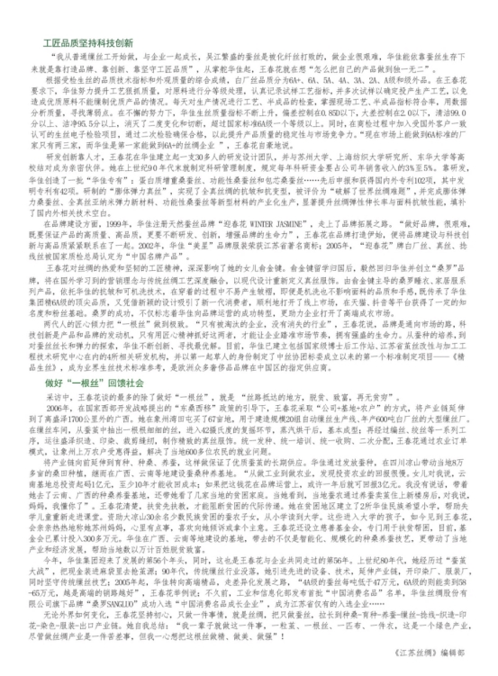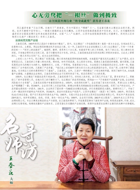吳江盛澤有著“日出萬綢,衣被天下”的美譽,作為中國四大“綢都”之一,見證著無數(shù)本土繅絲企業(yè)的興衰。然而,在歲月磨礪中堅守初心、一路做大做強的企業(yè)鳳毛麟角,江蘇華佳控股集團就是其中佼佼者。近日,本刊編輯來到盛澤采訪全國繭絲綢行業(yè)終身成就獎獲得者、全國“三八”紅旗手、江蘇華佳控股集團有限公司董事長、蘇州吳江區(qū)非物質(zhì)文化遺產(chǎn)(繅絲技藝)傳承人王春花。