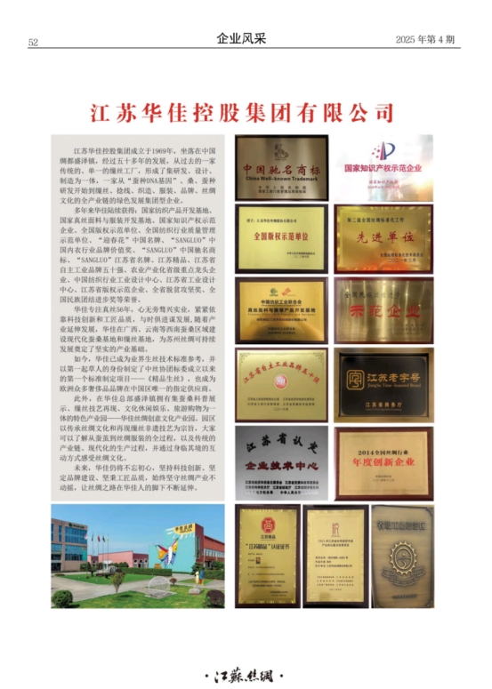 多年來華佳陸續(xù)獲得:國家紡織產(chǎn)品開發(fā)基地、國家真絲面料與服裝開發(fā)基地、國家知識產(chǎn)權(quán)示范企業(yè)、全國版權(quán)示范單位、全國紡織行業(yè)質(zhì)量管理示范單位、“迎春花”中國名牌、“SANGLUO”中國內(nèi)衣行業(yè)品牌價值獎、“SANGLUO”中國馳名商標(biāo)、“SANGLUO”江蘇省名牌、江蘇精品、江蘇省自主工業(yè)品牌五十強、農(nóng)業(yè)產(chǎn)業(yè)化省級重點龍頭企業(yè)、中國紡織行業(yè)工業(yè)設(shè)計中心、江蘇省工業(yè)設(shè)計中心、江蘇省版權(quán)示范企業(yè)、全省脫貧攻堅獎、全國民族團結(jié)進步獎等榮譽。