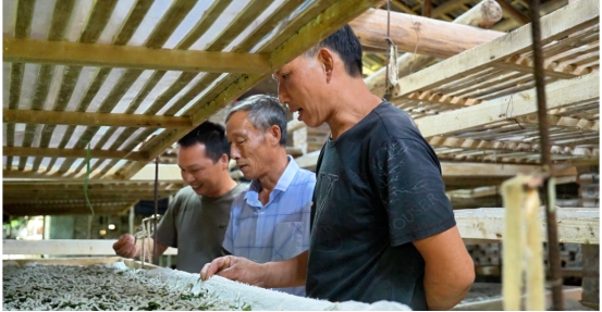 “我以前在外務(wù)工時,聽說家鄉(xiāng)養(yǎng)蠶行業(yè)發(fā)展非常好,回來后發(fā)現(xiàn)駐村工作隊和政府對養(yǎng)蠶行業(yè)支持力度非常大,我就跟著柏隊長一起學(xué)習(xí)養(yǎng)蠶,我以前在外務(wù)工,一個月就4、5千塊錢,現(xiàn)在一個月能養(yǎng)4、5張蠶種,收入有一萬多塊錢,感覺前景非常好,值得去做?!彼麓宕迕窭滋灬φf。