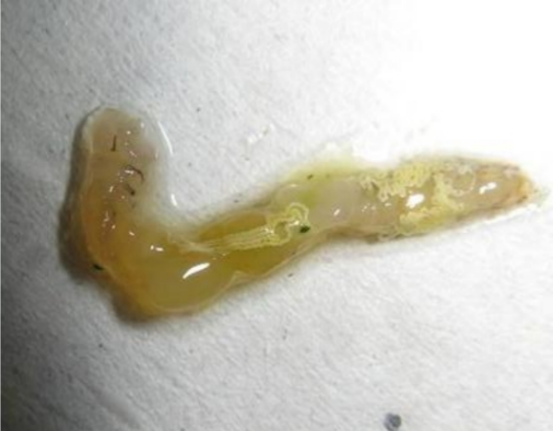 2、消化道病變:感染 1 周后呈現(xiàn)典型 “空頭” 癥狀,消化管內無桑葉殘留,充滿黃綠色或黃褐色液體,后期排鏈珠狀蠶糞或濕糞,尾部潮濕;