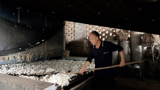 在東興區(qū)高梁蠶繭站烘干房,收購裝車的蠶繭在這里烘干,消除繭內(nèi)水分。整個烘干流程長達(dá)5個半小時,烘干后的蠶繭將被運往全國各地進行銷售和深加工。