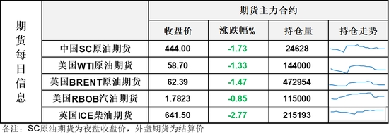 【1】WTI主力原油期貨收跌0.79美元,跌幅1.33%,報(bào)58.7美元/桶;布倫特主力原油期貨收跌0.93美元,跌幅1.47%,報(bào)62.39美元/桶;INE原油期貨收跌1.73%,報(bào)444元。