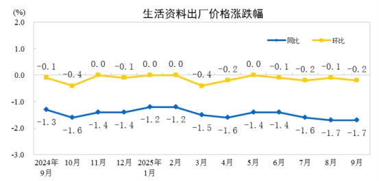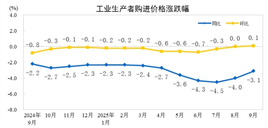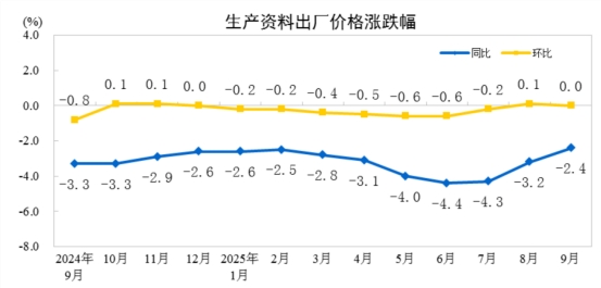 2025年9月份,全國(guó)工業(yè)生產(chǎn)者出廠(chǎng)價(jià)格同比下降2.3%,降幅比上月收窄0.6個(gè)百分點(diǎn),環(huán)比繼續(xù)持平。工業(yè)生產(chǎn)者購(gòu)進(jìn)價(jià)格同比下降3.1%,降幅比上月收窄0.9個(gè)百分點(diǎn),環(huán)比上漲0.1%。1—9月平均,工業(yè)生產(chǎn)者出廠(chǎng)價(jià)格比上年同期下降2.8%,工業(yè)生產(chǎn)者購(gòu)進(jìn)價(jià)格下降3.2%。