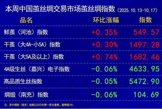 今日(2025年10月17日,周五)中國繭絲綢交易市場生絲電子指數(shù)微跌0.04%收于4633.95點(diǎn),本周生絲指數(shù)累計(jì)下跌0.06%。B絲2022D(商檢4A級生絲):251025合約下跌0.06萬元報收于46.08萬元;260325合約上漲0.03萬元報收于46.65萬元;260925合約下跌0.03萬元報收于46.53萬元。