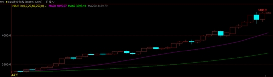COMEX黃金(582, 8.80, 1.54%)期貨漲3.82%,報(bào)4374.3美元/盎司;現(xiàn)貨黃金漲2.48%,報(bào)4357.36美元/盎司;盤(pán)中均一度創(chuàng)歷史新高。COMEX白銀(8131, -9.00, -0.11%)期貨漲2.59%,報(bào)51.4美元/盎司。