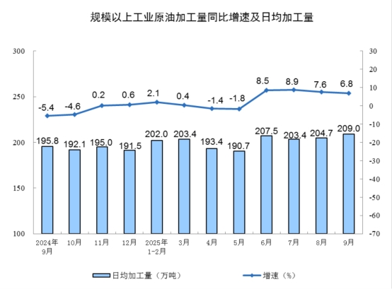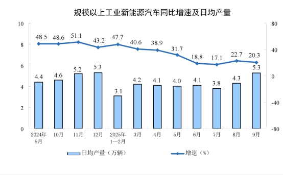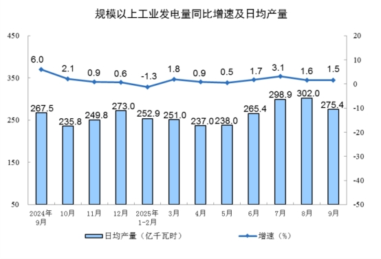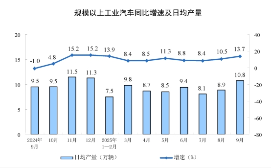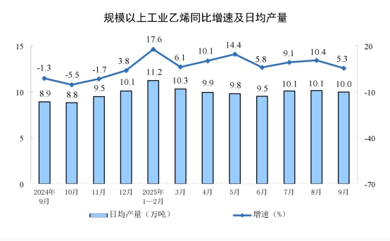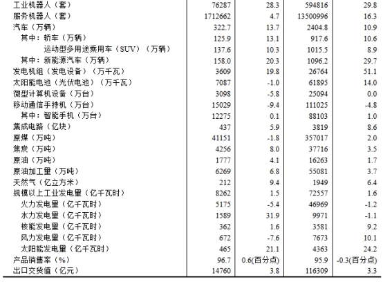 分產(chǎn)品看,9月份,規(guī)模以上工業(yè)623種產(chǎn)品中有362種產(chǎn)品產(chǎn)量同比增長(zhǎng)。其中,鋼材12421萬(wàn)噸,同比增長(zhǎng)5.1%;水泥15444萬(wàn)噸,下降8.6%;十種有色金屬695萬(wàn)噸,增長(zhǎng)2.9%;乙烯299萬(wàn)噸,增長(zhǎng)5.3%;汽車322.7萬(wàn)輛,增長(zhǎng)13.7%,其中新能源汽車158.0萬(wàn)輛,增長(zhǎng)20.3%;發(fā)電量8262億千瓦時(shí),增長(zhǎng)1.5%;原油加工量6269萬(wàn)噸,增長(zhǎng)6.8%。