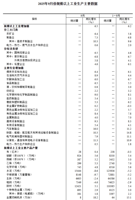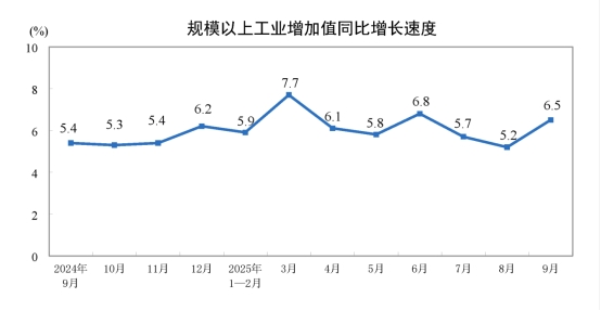 9月份,規(guī)模以上工業(yè)增加值同比實(shí)際增長(zhǎng)6.5%(增加值增速均為扣除價(jià)格因素的實(shí)際增長(zhǎng)率)。從環(huán)比看,9月份,規(guī)模以上工業(yè)增加值比上月增長(zhǎng)0.64%。1—9月份,規(guī)模以上工業(yè)增加值同比增長(zhǎng)6.2%。