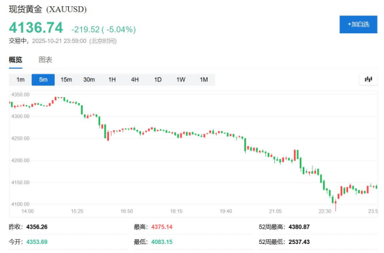 截至周一連續(xù)第六個(gè)交易日創(chuàng)盤中歷史新高的黃金(582, 8.80, 1.54%)創(chuàng)十二年來最大跌幅。美股早盤時(shí)段刷新日低時(shí),現(xiàn)貨黃金逼近4082美元,日內(nèi)跌約6.3%,創(chuàng)2013年4月以來最大日內(nèi)跌幅,紐約期金跌至4093美元,日內(nèi)跌6.1%。