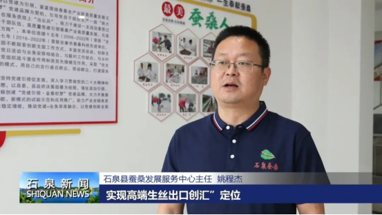 石泉縣蠶桑發(fā)展服務(wù)中心主任 姚程杰:下一步,我們將進(jìn)一步明確打造“6A級(jí)優(yōu)質(zhì)繭絲基地,實(shí)現(xiàn)高端生絲出口創(chuàng)匯”定位及實(shí)施蠶桑產(chǎn)業(yè)品牌戰(zhàn)略相關(guān)工作任務(wù),對(duì)縣域蠶桑龍頭企業(yè)等經(jīng)營(yíng)主體開(kāi)展“一對(duì)一”幫扶服務(wù),指導(dǎo)其加大產(chǎn)品開(kāi)發(fā)和“三品一標(biāo)”認(rèn)證,擦亮鎏金銅蠶品牌。