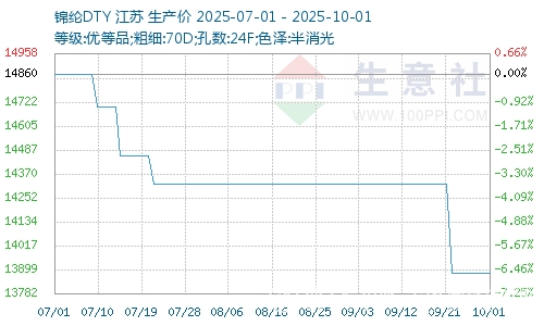 2025年第三季度,錦綸長(zhǎng)絲市場(chǎng)缺乏利好,價(jià)格走勢(shì)整體向下。以錦綸DTY為例,截止9月30日,江蘇地區(qū)錦綸長(zhǎng)絲DTY(優(yōu)等品;70D/24F)報(bào)價(jià)13880元/噸,較去年同期下跌4340元/噸,跌幅達(dá)23.82%。
