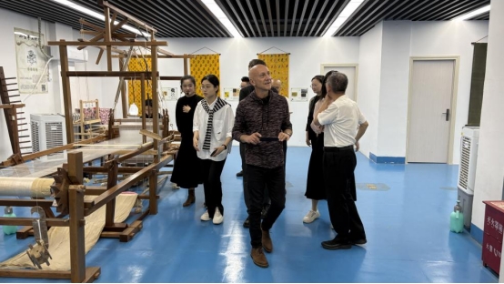 考察期間,古絲綢織繡技藝研究院院長王繼勝及相關(guān)學(xué)科帶頭人熱情接待了維克多教授一行,并陪同參觀了研究院的成果展廳與面料再造實(shí)驗(yàn)室。