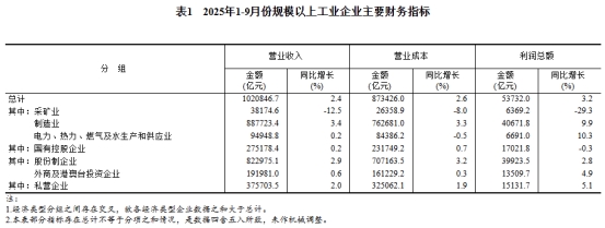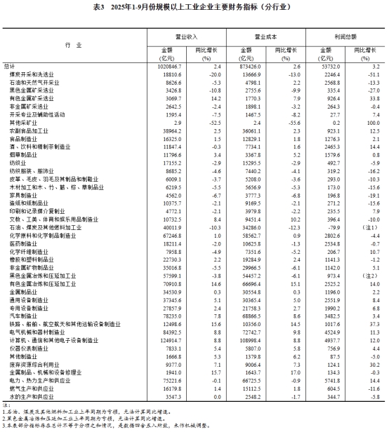 1—9月份,全國規(guī)模以上工業(yè)企業(yè)實現(xiàn)利潤總額53732.0億元,同比增長3.2%(按可比口徑計算,詳見附注二)。