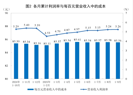 1—9月份,規(guī)模以上工業(yè)企業(yè)實現(xiàn)營業(yè)收入102.08萬億元,同比增長2.4%;發(fā)生營業(yè)成本87.34萬億元,增長2.6%;營業(yè)收入利潤率為5.26%,同比提高0.04個百分點。