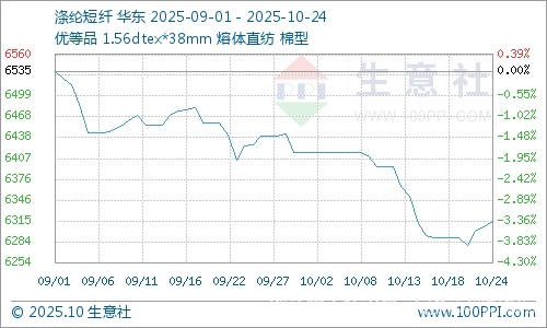 據(jù)商品行情分析系統(tǒng),本周(10月20-24日)國(guó)內(nèi)滌綸短纖價(jià)格小幅上漲,截止10月24日滌綸短纖(1.4D*38mm)市場(chǎng)均價(jià)在6314元/噸,較周初上漲0.38%。