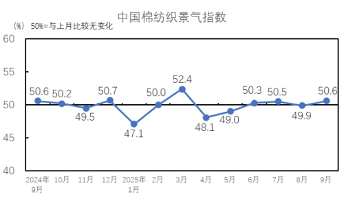 2025年9月,生產(chǎn)指數(shù)為51.1%,高于臨界點,較8月上升1.2個百分點,紡織廠生產(chǎn)情況較8月上升。從分項指數(shù)看,棉紡織廠設(shè)備開臺率指數(shù)為51.6%,高于臨界點,較8月上升2.3個百分點。紗產(chǎn)量指數(shù)為49.8%,較8月下降1.3個百分點;布產(chǎn)量指數(shù)為51.7%,較8月上升2.3個百分點;紗產(chǎn)量指數(shù)低于臨界點,布產(chǎn)量指數(shù)高于臨界點。