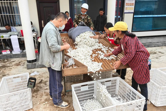 “今年你家的繭子個頭大、色澤亮,肯定能賣個好價錢?!薄澳慵业囊膊徊睿粗驮鷮嶏枬M。”一大早,蠶農(nóng)們便肩扛裝滿蠶繭的竹筐,有序排隊等候收購,相互交流著養(yǎng)蠶心得,不時傳來陣陣贊嘆。收購現(xiàn)場,工作人員熟練地進行蠶繭品質(zhì)鑒定、等次劃分、抽樣檢測、過磅稱重、開單兌付等一系列操作,流水線式的作業(yè)高效有序,將一袋袋蠶繭轉化為蠶農(nóng)手中沉甸甸的收入,現(xiàn)場繁忙而喜慶。