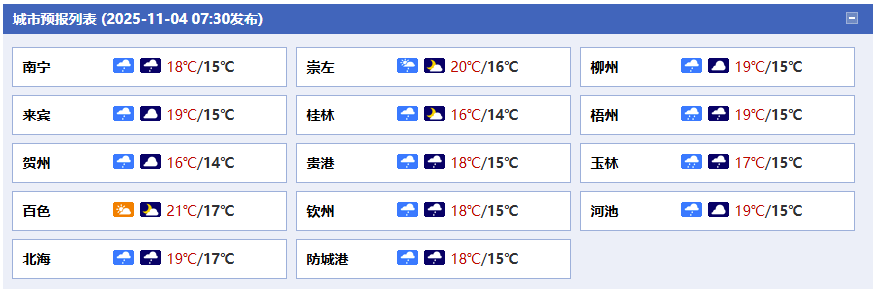 昨天到今日清晨,廣西大部被陰沉天色籠罩,涼意十足。據(jù)氣象數(shù)據(jù)顯示,4日08時(shí)前24小時(shí),全區(qū)普降小到中雨,局地出現(xiàn)大雨天氣。在雨水打壓下,氣溫繼續(xù)下降。今早08時(shí),廣西各地氣溫均跌至 “1 字開頭”,其中南丹寒冷感尤為明顯,氣溫低至11.2℃。