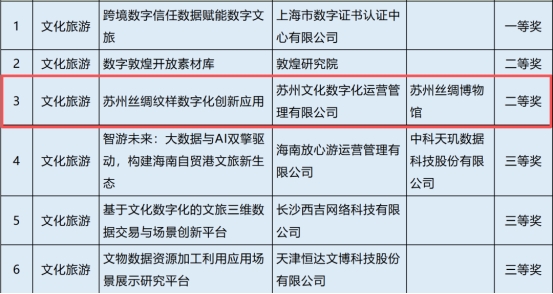 近日,2025年“數(shù)據(jù)要素×”大賽全國總決賽獲獎項目名單公示。蘇州文化數(shù)字化運營管理有限公司、蘇州絲綢博物館聯(lián)合參賽的“蘇州絲綢紋樣數(shù)字化創(chuàng)新應(yīng)用”項目榮獲“文化旅游”賽道全國二等獎。作為一項全國性重要賽事,2025年“數(shù)據(jù)要素×”大賽圍繞行業(yè)領(lǐng)域設(shè)置13個賽道,鼓勵培育數(shù)據(jù)開發(fā)利用新模式新業(yè)態(tài)。本次大賽全國報名隊伍超過2.2萬支,共角逐出近900個項目晉級全國總決賽。在稍前進(jìn)行的江蘇分賽中,“蘇州絲綢紋樣數(shù)字化創(chuàng)新應(yīng)用”項目榮獲“文化旅游”賽道全省一等獎,晉級全國總決賽。