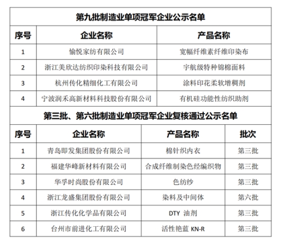 近日,全國32個省(自治區(qū)、直轄市)工信主管部門在官網(wǎng)公示了第九批及通過復核的第三批、第六批制造業(yè)單項冠軍企業(yè)名單,其中中國印染行業(yè)協(xié)會多家會員單位榜上有名。