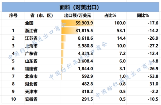 2025年1-9月,我國(guó)紡織服裝累計(jì)對(duì)美出口339.57億美元,同比下降10.1%。浙江省、江蘇省、廣東省、山東省、上海分別列全國(guó)紡織服裝對(duì)美出口省市前五位,合計(jì)比重超八成。