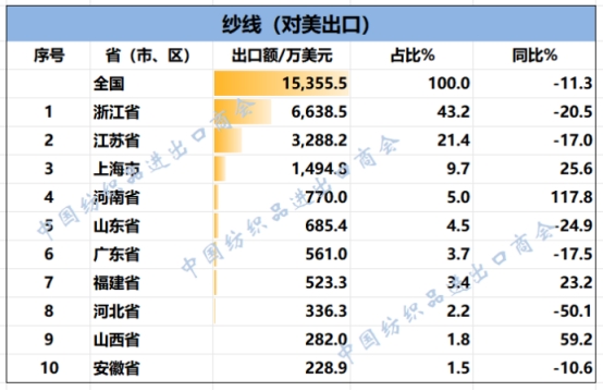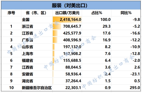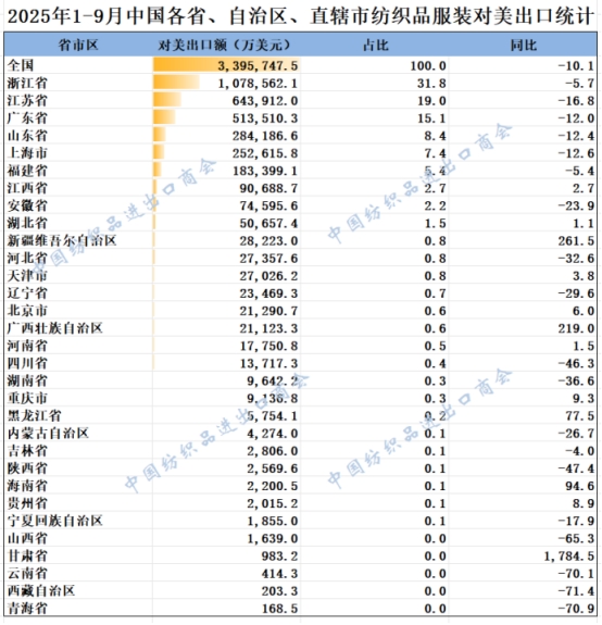 2025年1-9月我國(guó)紡織服裝重點(diǎn)省市對(duì)美出口概況