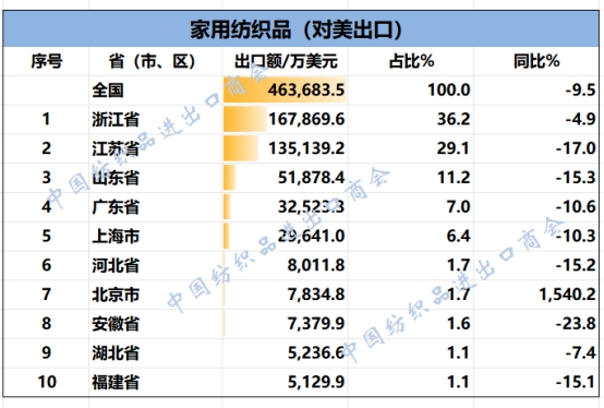 2025年1-9月,紡織服裝類重點(diǎn)商品對(duì)美出口前十名的省(市、區(qū))