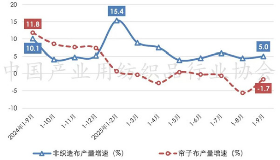 自2025年以來,我國非織造布產(chǎn)量呈現(xiàn)出“高開、回落、趨穩(wěn)”走勢,根據(jù)國家統(tǒng)計局數(shù)據(jù),2025年1-9月規(guī)模以上企業(yè)的非織造布產(chǎn)量同比增長5%,月均產(chǎn)量較二季度提升12.2%。簾子布市場需求放緩,產(chǎn)量整體處于負增長區(qū)間,1-9月規(guī)模以上企業(yè)的簾子布產(chǎn)量同比下降1.7%(圖2)。