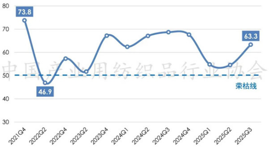 2025年前三季度,全球經(jīng)濟復(fù)蘇乏力、地緣政治沖突持續(xù)、主要經(jīng)濟體貨幣政策不確定性猶存;我國經(jīng)濟運行保持穩(wěn)中有進態(tài)勢,高質(zhì)量發(fā)展取得積極成效。面對復(fù)雜嚴峻的外部環(huán)境,我國產(chǎn)業(yè)用紡織品行業(yè)經(jīng)濟運行總體保持平穩(wěn),行業(yè)的生產(chǎn)、經(jīng)濟效益指標增速有所放緩,出口呈現(xiàn)溫和回暖趨勢。根據(jù)中國產(chǎn)業(yè)用紡織品行業(yè)協(xié)會調(diào)研,2025年前三季度我國產(chǎn)業(yè)用紡織品行業(yè)景氣指數(shù)為63.3,較上半年提升8.7個點(圖1)。