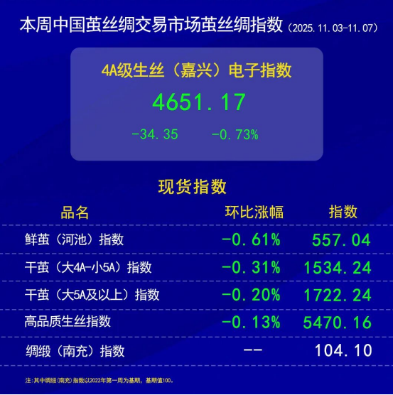 今日(2025年11月07日,周五)中國繭絲綢交易市場生絲電子指數(shù)下跌0.15%報收于4651.17點,本周生絲指數(shù)累計下跌0.73%。B絲2022D(商檢4A級生絲):251125合約下跌0.09萬元報收于46.20萬元;260325合約下跌0.12萬元報收于46.74萬元;260925合約下跌0.06萬元報收于46.80萬元。