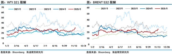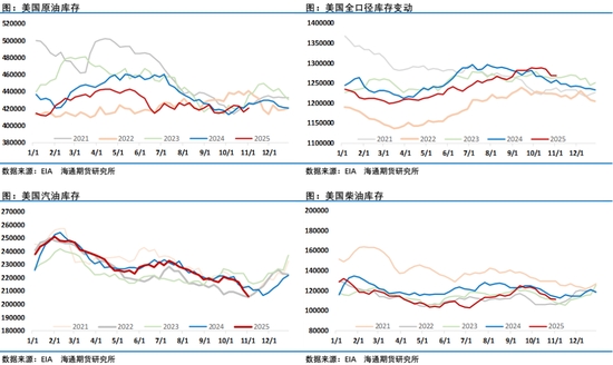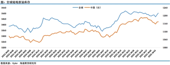 預(yù)測顯示,全球液態(tài)燃料消費(fèi)量在預(yù)測期內(nèi)每日將增加110萬桶。全球液態(tài)燃料消費(fèi)量的增長幾乎完全由非OECD國家驅(qū)動,這些國家在2025年每日增長120萬桶,在2026年每日增長100萬桶,而OECD國家的消費(fèi)量在2025年每日減少10萬桶,隨后在2026年每日增加10萬桶。非OECD國家的大部分增長集中在亞洲,其中相比2024年印度和中國的液態(tài)燃料消費(fèi)量到2026年每日將增加超過40萬桶。EIA強(qiáng)調(diào)對中國的需求預(yù)測僅包括最終消費(fèi),不包括庫存增加,過去幾個月來中國增加原油庫存的行為一直成為市場關(guān)注的一個熱點(diǎn),因缺乏官方數(shù)據(jù),各機(jī)構(gòu)通過追蹤的數(shù)據(jù)發(fā)現(xiàn)中國原油庫存持續(xù)增長,在三季度有所回落之后,10月底開始中國原油庫存再次回升,根據(jù)Kpler的高頻數(shù)據(jù)過去二周時間全球原油陸地庫存增加了3000萬桶,其中中國增加了1400萬桶。而目前水上原油仍維持在近年來高位,這部分水上庫存一旦成為顯性的陸地庫存預(yù)計(jì)將繼續(xù)給油價帶來壓力,目前來看市場對此也是高度警惕。考慮到對俄制裁及一些地緣因素給油價帶來的不確定性,最終供應(yīng)過剩壓力程度如何計(jì)價是需要接下來一段時間持續(xù)跟蹤的,這也是近期油價走勢猶豫的一個因素。