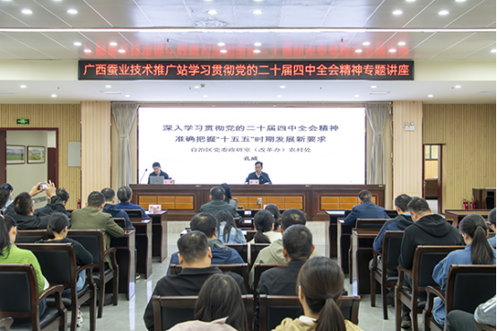 為深入學(xué)習(xí)宣傳貫徹黨的二十屆四中全會(huì)精神,11月11日上午廣西蠶業(yè)技術(shù)推廣站舉辦學(xué)習(xí)貫徹黨的二十屆四中全會(huì)精神專題講座。邀請(qǐng)自治區(qū)黨委政策研究室(改革辦)農(nóng)村處的孔威副處長(zhǎng)授課,講座由廣西蠶業(yè)技術(shù)推廣站書(shū)記、站長(zhǎng)卿軍主持,全站在職黨員參加。