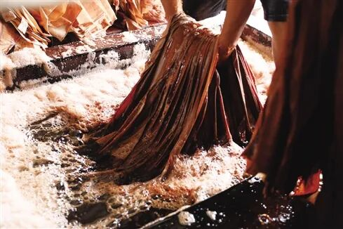 記者了解到,香云紗的染整技藝是國家級(jí)非物質(zhì)文化遺產(chǎn),流程包括挑選絲綢、薯莨液制備、浸莨水、曬莨、過河泥、清洗河泥和攤霧。反復(fù)的日曬與浸泡,才能制作出折射著金屬光芒與泥土色澤的香云紗。