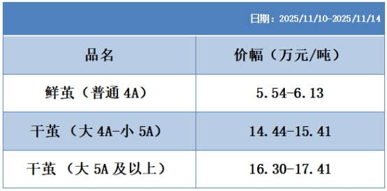 干繭價(jià)格指數(shù)方面,仍由全國(guó)鮮繭收烘與干繭貿(mào)易數(shù)據(jù)綜合構(gòu)成。其中,大 4A 至小5A干繭價(jià)格指數(shù)環(huán)比上周有所下滑,而大 5A 及以上干繭價(jià)格指數(shù)環(huán)比有所收紅,反映市場(chǎng)對(duì)高品質(zhì)干繭的需求仍相對(duì)穩(wěn)健。
