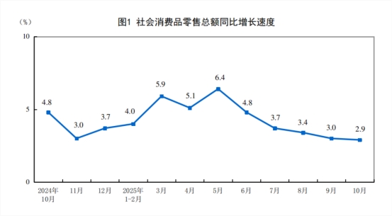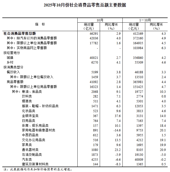 10月份,社會(huì)消費(fèi)品零售總額46291億元,同比增長(zhǎng)2.9%。其中,除汽車(chē)以外的消費(fèi)品零售額42036億元,增長(zhǎng)4.0%。1—10月份,社會(huì)消費(fèi)品零售總額412169億元,增長(zhǎng)4.3%。其中,除汽車(chē)以外的消費(fèi)品零售額372160億元,增長(zhǎng)4.9%。