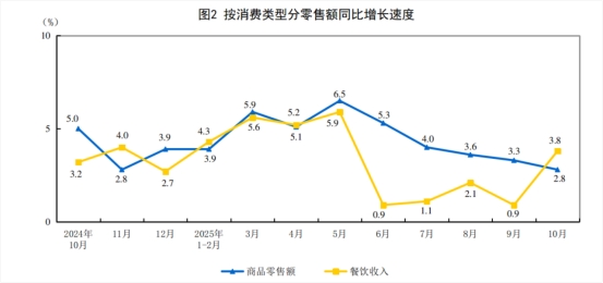 按消費(fèi)類(lèi)型分,10月份,商品零售額41092億元,同比增長(zhǎng)2.8%;餐飲收入5199億元,增長(zhǎng)3.8%。1—10月份,商品零售額365981億元,增長(zhǎng)4.4%;餐飲收入46188億元,增長(zhǎng)3.3%。