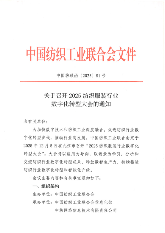 中國紡織工業(yè)聯(lián)合會關(guān)于召開2025紡織服裝行業(yè)數(shù)字化轉(zhuǎn)型大會的通知