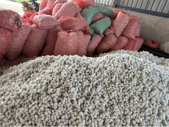 清晨,普洱市鎮(zhèn)沅彝族哈尼族拉祜族自治縣九甲鎮(zhèn)老街子蠶繭收購點(diǎn)便熱鬧不已,滿載蠶繭的農(nóng)用車整齊排列,交售隊(duì)伍絡(luò)繹不絕。堆積的蠶繭宛如一座“雪山”,昭示著晚秋蠶繭的豐收。
