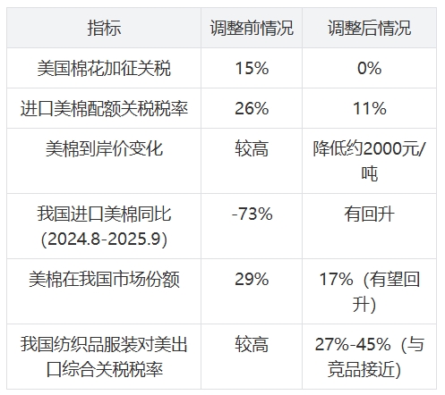 就在出口數(shù)據(jù)公布之際,中美經(jīng)貿(mào)合作傳來重磅利好,為紡織行業(yè)注入強心劑。根據(jù)國務(wù)院關(guān)稅稅則委員會11月5日公告,自2025年11月10日起,我國停止對原產(chǎn)于美國的棉花加征15%關(guān)稅,進口美棉配額關(guān)稅稅率由26%降至11%。美方同步落地配套政策,將對華“芬太尼關(guān)稅”下調(diào)10%,并將24%的對華關(guān)稅暫停期延長至2026年11月。