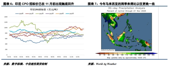 馬來西亞通常于11月迎來雨季,這是馬棕11月季節(jié)性減產(chǎn)的底層邏輯。然而,今年馬來西亞的雨季來得比以往更晚一些,直到11月14日才正式開始,這在一定程度引致了馬棕11月中上旬的產(chǎn)量下降不明顯。雨季推遲疊加前期充沛降雨、勞動力改善、施肥增加,共同促成了馬來半島11月前20日環(huán)比依然增長的的產(chǎn)量表現(xiàn)。