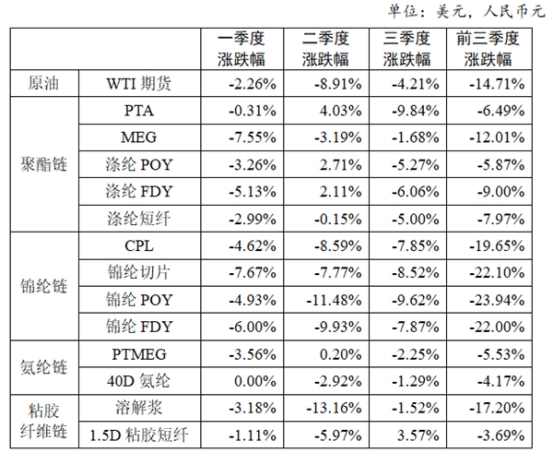 由于原料端支撐減弱,化纖產(chǎn)品市場價格同比下降。聚酯鏈方面,一季度纖維產(chǎn)品價格跌幅普遍大于其原料跌幅,壓縮盈利空間;二季度纖維產(chǎn)品價格雖上漲,但漲幅普遍不及其原料漲幅,再度壓縮盈利空間;三季度纖維產(chǎn)品價格雖處于下滑趨勢,但其原料降幅更為明顯,加工差有所擴(kuò)大(圖3)。錦綸鏈方面,前三季度各環(huán)節(jié)價格下滑態(tài)勢明顯,跌幅均在20%左右(圖4、表1)。