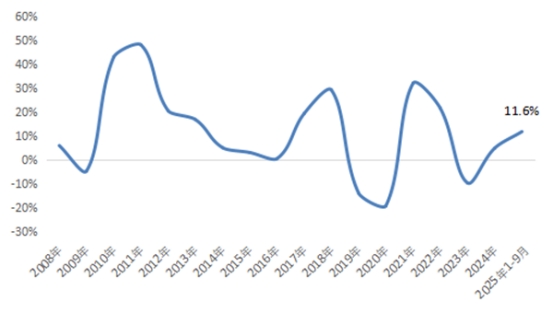 根據(jù)國家統(tǒng)計(jì)局?jǐn)?shù)據(jù),2025年1-9月化纖產(chǎn)量同比增長5.6%,產(chǎn)量增速較2024年同期和全年均有所放緩,但較1-6月小幅提升0.69個百分點(diǎn),總體來看基本保持平穩(wěn)(圖1)。