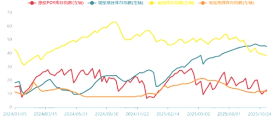 庫存方面,滌綸長絲受益于5月中旬企業(yè)集中安排停產(chǎn)檢修,5、6月庫存去化進(jìn)程加快,7月庫存有所回升并在中旬達(dá)到26天(以POY為例),此后呈現(xiàn)震蕩下降趨勢,10月末降至9天(圖2)。錦綸庫存大幅增加,雖然二、三季度減產(chǎn)幅度擴(kuò)大,但僅是減緩了庫存上升的速度,10月末升至46天。氨綸庫存則延續(xù)2024年下半年以來的高位震蕩態(tài)勢,上半年基本維持在50天左右;7月下旬庫存出現(xiàn)下降趨勢,10月末降至40天。