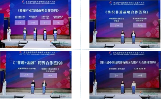 現(xiàn)場,中國紡織工業(yè)聯(lián)合會(huì)非遺辦與成都紡織高等??茖W(xué)校、四川富潤企業(yè)重組投資有限責(zé)任公司、四川安娜凱瑟莉服飾有限公司共同舉行“蜀錦產(chǎn)業(yè)發(fā)展戰(zhàn)略合作簽約”;中國紡聯(lián)非遺辦與北京時(shí)尚控股有限責(zé)任公司進(jìn)行“紡織非遺戰(zhàn)略合作簽約”;交通銀行成都東部新區(qū)支行與成都紡織高等??茖W(xué)校進(jìn)行“‘非遺+金融’跨界合作簽約”;值得一提的是,大會(huì)將于2026年迎來第十屆,現(xiàn)場舉行了中國紡織工業(yè)聯(lián)合會(huì)與東莞市大朗鎮(zhèn)“第十屆中國紡織非物質(zhì)文化遺產(chǎn)大會(huì)落址簽約”,將傳承的火炬繼續(xù)傳遞。一系列的簽約匯聚了國家級(jí)行業(yè)組織、專業(yè)高等院校、地方政府、金融機(jī)構(gòu)和實(shí)力企業(yè),標(biāo)志著紡織非遺從技藝研究、產(chǎn)品開發(fā)到市場應(yīng)用的完整產(chǎn)業(yè)鏈條被成功打通,為非遺新生注入了強(qiáng)勁動(dòng)能。