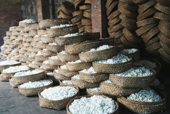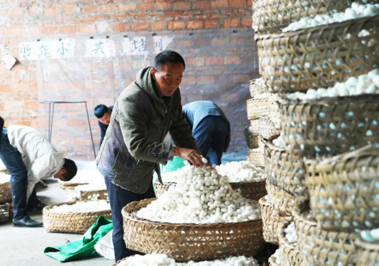 集鎮(zhèn)上的蠶繭站里,村民們肩扛手提,送來一袋袋雪白飽滿的蠶繭。過秤、登記、烘干……蠶繭站的老陳這幾天忙得不可開交?!懊刻於加修r(nóng)戶來賣繭,”他介紹,“養(yǎng)蠶受天氣影響小,一個多月就能變現(xiàn),四季都有收入,資金回籠也快。這幾年,養(yǎng)蠶的農(nóng)戶越來越多?!?o:p>